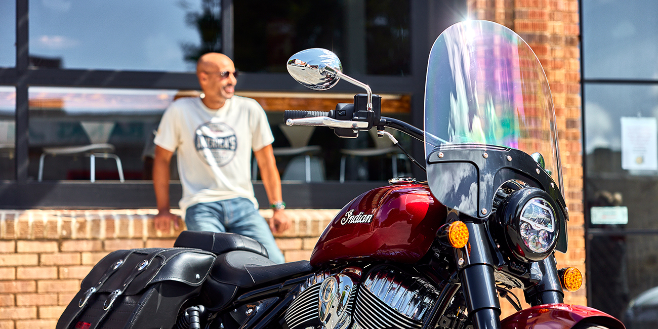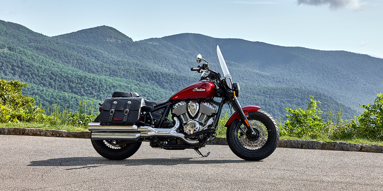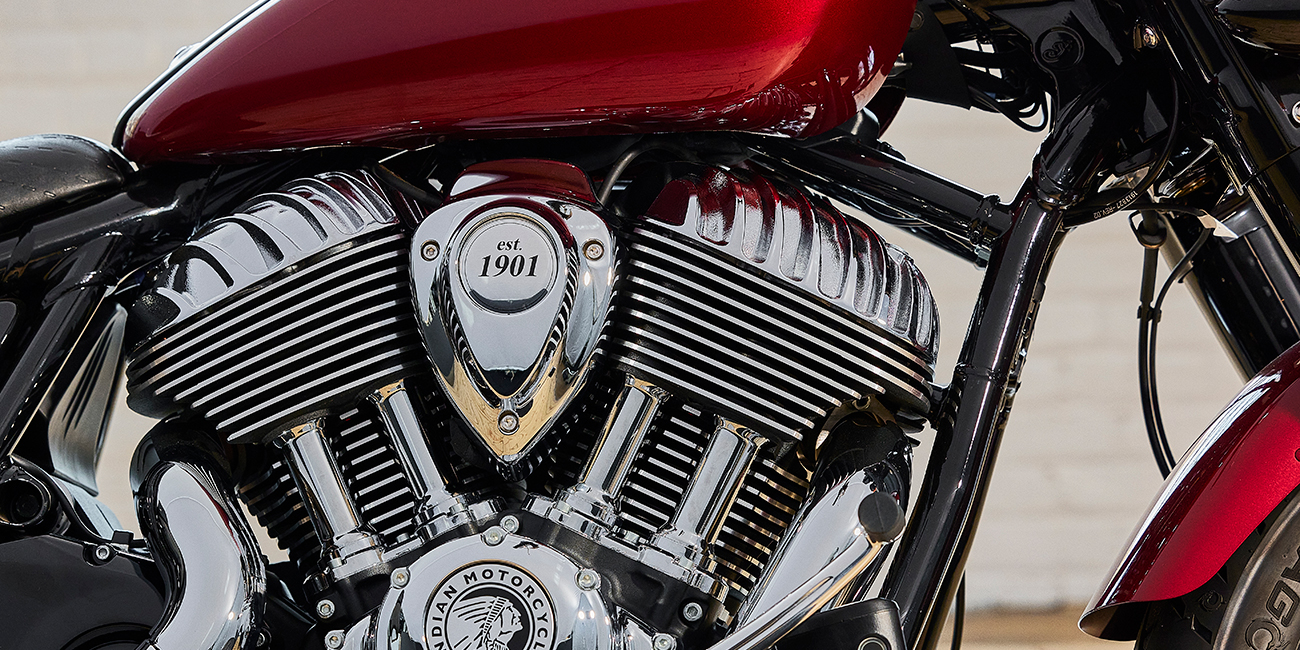 Acabamentos premium cromados, tampas de proteção nas bainhas, jantes de raios, larga moldura da ótica dianteira e o icónico logótipo da Indian Motorcycle no depósito de combustível.